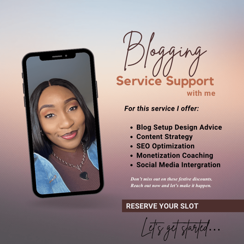 Struggling to kickstart or level up your blog, I offer guided virtual 1-on-1 support tailored to your needs whether you’re just starting or looking to optimize your blog.