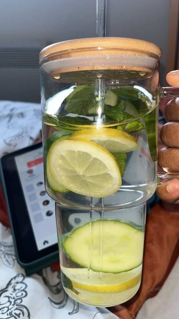 So for drinks, I’ve been having a lot of green tea on an empty stomach in the morning and detox water (cucumber, lemon, fresh mint) all day long, which is quite refreshing, can’t lie.