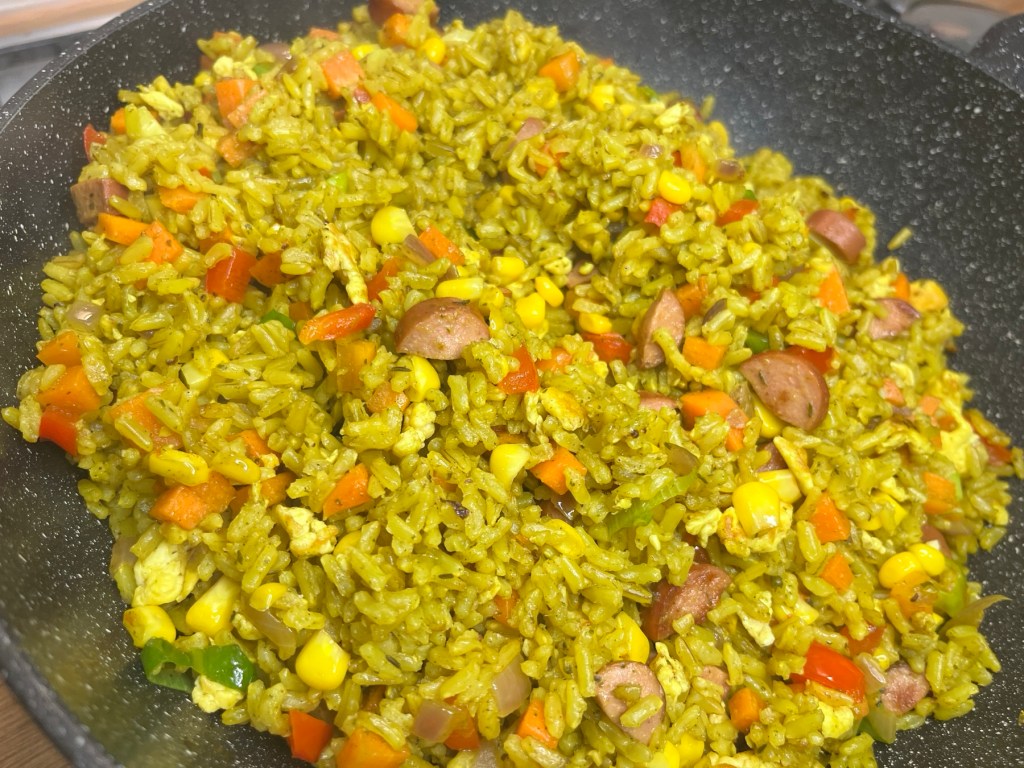Then in a nonstick pan, add cooking butter, eggs, then frankfurters, combine, remove from pan, then put a little more cooking butter add the mixed veggies your diced earlier starting with carrots add a little seasoning cubes and salt to taste.